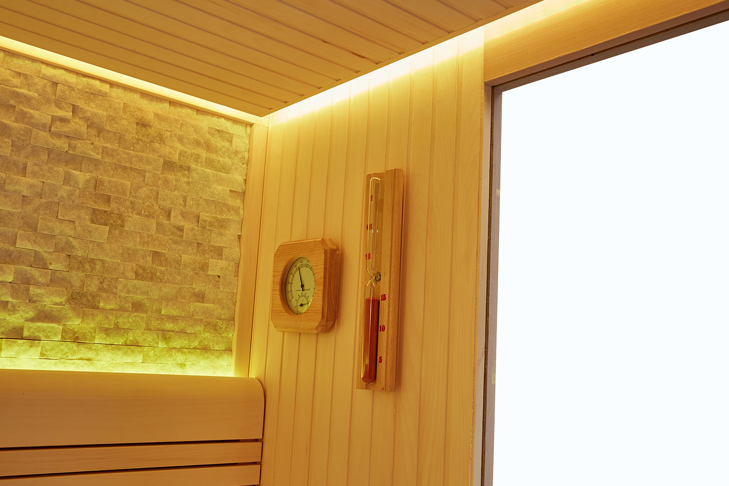 our sauna room equipped with sauna set, such as thermohygrometer, sandglass,sauna stone, cask spoon, lamp can for customer using.