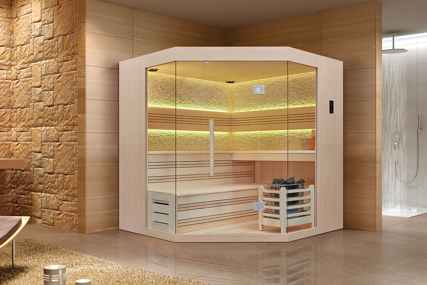 The luxury sauna room is equipped with culture stone, including crystal stone, salt stone, white stone, and so on. Customers can choose their configurations according to their favorite then they can design a special sauna room for themselves.